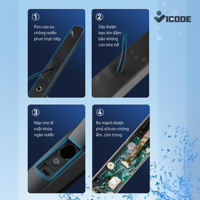 | Quản lý bằng mật khẩu chủ và mật khẩu người dùng Managed by master password and user password Cài đặt dễ dàng qua app điện thoại, không cần ghi nhớ các câu lệnh phức tạp Easy-installation via mobile app, no need to remember complicated setting command Có thể thay đổi linh hoạt giữa 2 chế độ khóa tự động và thủ công. Auto/Manual locking mode is changeable. Khóa sẽ tạm ngưng hoạt động trong 2 phút sau khi nhập sai mã/vân tay/thẻ từ 5 lần liên tiếp. If incorrect fingerprint/PIN code/Card are attempted 5 times in a row, the related verification method will be lockout for 2 minutes. Kiểm soát khóa từ xa và điều khiển bằng giọng nói qua Amazon Alexa, Google Assistant (Tùy chọn) Remotely control your smart lock and can work with voice control service Amazon Alexa, Google Assistant (Optional) | Tích hợp khả năng chống sốc điện Electric shock resistance Chức năng chống sao chép mật khẩu bằng cách sử dụng kèm mật mã ảo A password can be entered with a random number to prevent stealing Có thể kích hoạt chế độ yên lặng khi cần thiết Silent mode can be activated when needed Hướng dẫn cài đặt bằng giọng nói (Tiếng Việt / Tiếng Anh) Voice guidance feature (Vietnamese / English) Tích hợp âm thanh cảnh báo Pin yếu Low-battery warning by sound |